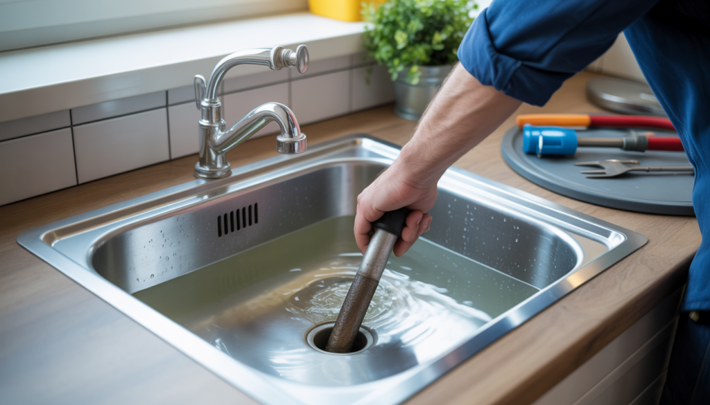 Pour les bouchons tenaces, quelques outils simples peuvent suffire. La ventouse fonctionne bien pour les obstructions proches lorsqu’il y a une bonne étanchéité. Le furet de plomberie atteint les bouchons plus profonds sans démontage complet. Pour un nettoyage en profondeur, l’hydrocurage effectué par des spécialistes élimine sédiments et racines.
